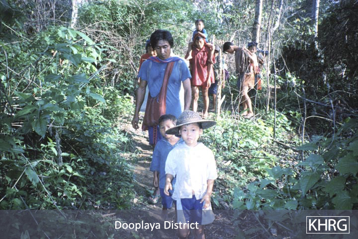 Photos # 10-174, 10-175, 10-176, 10-177, 10-178, 10-179, 10-180, 10-181: Villagers fleeing forced relocation in Kya In township, Dooplaya District in mid-2002. On February 24 th , SPDC IB #78, IB #77, and LIB #83 ordered all villages in Ta Gu Kee area to move to Meh T'Kreh and said they would shoot on sight anyone who remained. Between April 27 th and May 12 th , troops from SPDC LIB #301, LIB #416, and IB #78 entered Tee Th'Blu, Kaw Keh, Tee P'Nweh, Paw Ner Mu, Done P'Loung, and Tee Khaing villages, ordered the villagers out without specifying a destination, and burned their houses, schools, churches and food supplies. As a result, hundreds of villagers fled to Noh Po refugee camp in Thailand. Photos 10-174 through 10-177 show them heading for the Thai border in late May and early June 2002. Photo 10-178 shows a group that had just arrived at the refugee camp in late May. Photo 10-179 shows Naw H--- and her family; when IB #78 ordered their village of Tee Law P'Leh to move within 4 days to Lay Wah Kah on April 27 th , they obeyed, but after two weeks doing forced labour every day and without proper shelter, food or medical help at the relocation site, they fled to Thailand in mid-June. After three months at a relocation site, Saw P--- and his family ( photo 10-180 ) also fled in mid-June, saying there was no way of surviving at the site and they were forced to work constantly for the Army. Naw P---, 23 ( photo 10-181 ), fled with her baby in June after two weeks at Meh T'Kreh relocation site for the same reasons. [Photos: KHRG researcher]