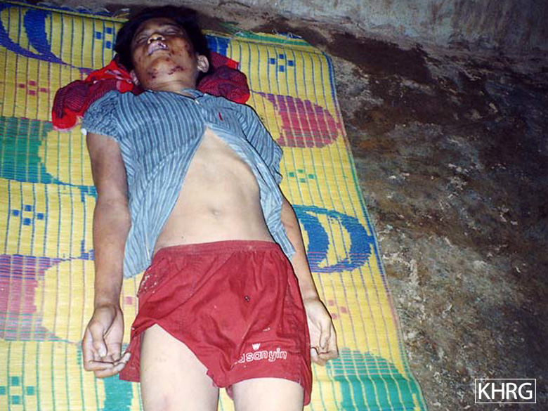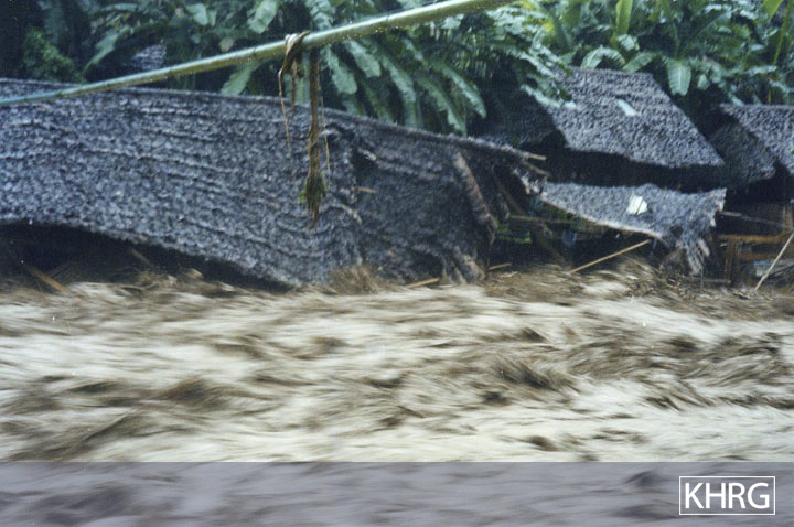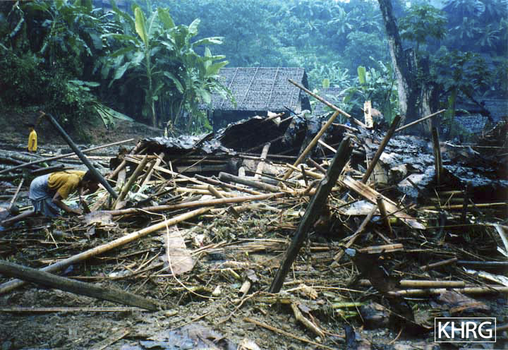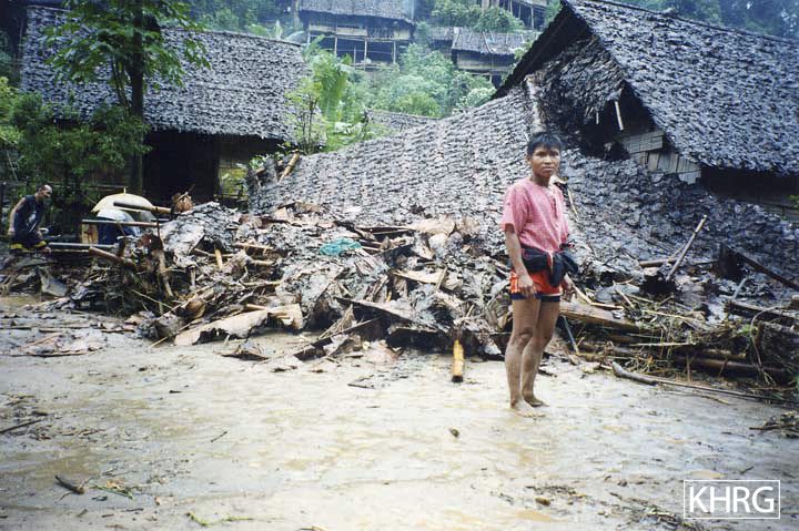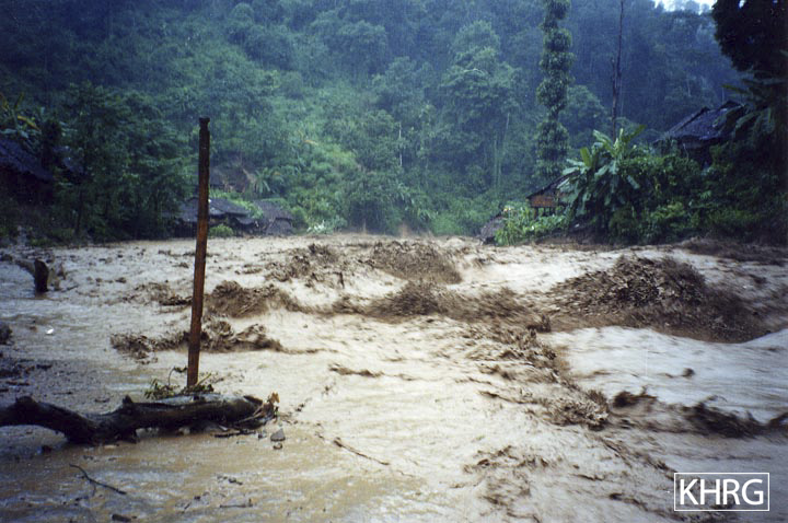 Photos #10-182, 10-183, 10-184, 10-185, 10-186, 10-187, 10-188, 10-189, 10-190, 10-191, 10-192, 10-193, 10-194: Villagers who manage to cross into Thailand, avoid forced repatriation by Thai authorities, and find their way into a Karen or Karenni refugee camp are still not safe. Since 1995, Thai authorities have consolidated the refugee camps and progressively moved them closer to the border (contrary to established UN refugee guidelines) and onto more unstable and unlivable terrain, as part of a deliberate policy to make life difficult and dangerous for refugees in the hope that they will decide to return to Burma instead. One result has been attacks by Burmese forces on unprotected refugee camps; another has been deaths by natural disasters due to the placement of refugee camps in steep and unstable gullies. On September 2 nd 2002, flash floods swept away houses in Meh Ka Kee (Mae Khong Kha) Karen refugee camp opposite northern Pa'an district, killing at least nine refugees. Photos 10-182 through 10-184 show the waters raging through the camp. Photo 10-185 shows all that remains of a house that stood in the way, and photo 10-186 shows the remains of the barracks for newly arrived refugees. Those killed included Naw Lah May, 17 ( photo 10-187 ); Saw Tah Pu Lu, 14 ( photo 10-188 ); Saw Hsa K'Pru, 26; Saw Kyaw Ta Muh, 19 ( photo 10-189 ); Naw Wah, 12 ( photo 10-190 ); Naw Lay Way Paw, 18 ( photo 10-191 ); Naw Mu Si Si, 10 ( photo 10-192 ); Saw Johnson Mu, 19 ( photo 10-193 ); and Saw Kyaw Htoo, 49 ( photo 10-194 ). The camp is built along steep and narrow gullies extremely vulnerable to flash floods and landslides. Making matters worse, when floodwaters rise Thai authorities sometimes open the dam upstream at Mae Sariang without notifying villagers or refugees downstream. This has caused deaths in villages near Meh Ka Kee in the past, though it is not confirmed whether it happened in this case. [Photos: KHRG researcher]