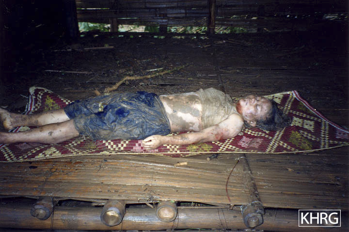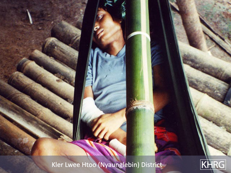 Photo #11-47: On June 21 st 2002, an SPDC unit found the IDP hiding site at L--- in Shwegyin township, Nyaunglebin District, sending the villagers fleeing deeper into the forest. They left later that same day, but not before planting a number of landmines in and around the site. The following day, 35 year old Saw Lweh Po stepped on one of these landmines while trying to catch some fish for his wife and four day old baby in a nearby stream. His two companions who were with him at the time carried him back to the IDP site, but were unable to treat him as they had no medicine. They put him in this hammock slung from a bamboo pole and carried him eastward through the hills for five days to a KNU clinic, where this photo was taken on the afternoon of June 29 th , 2002. He died two days later. [Photo: KHRG researcher]