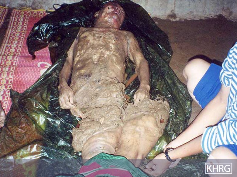 Photo #10-147: Saw S--- from K--- village, Dweh Loh township, Papun district was forced to go as a porter for SPDC LIB #2 Column 1 (Major Tin Htun commanding) in 2002. On his return home he was continually sick. His spleen was swollen and he couldn't work. [Photo: KHRG researcher]