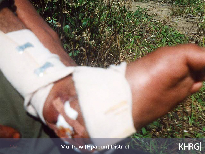 Photos # 11-48, 11-49: Saw K---, 38 years old from T--- village in Lu Thaw township, Papun District. On June 8 th 2002 he stepped on an SPDC landmine planted by Light Infantry Division #101 in the forest near D--- village. He was never able to receive proper treatment or medicine, so when this photo was taken in January 2003 his wounds had still not properly healed. [Photos: KHRG researcher]