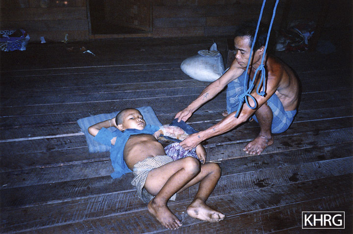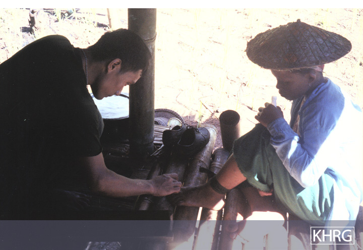 Photo #10-143: Internally displaced villagers from all around gathered at this forest clearing in Lu Thaw township, Papun district on January 7 th 2004 to receive treatment from Karen medics. To the left, villagers are awaiting diagnosis. In the centre is the 'intensive care unit', where those on intravenous drips lie on a bed of rice straw. Photos #10-144, 10-145: Internally displaced villagers who are ill in the forests of Toungoo district in January 2004 ( photo 10-144 ) and Papun district in March 2004 ( photo 10-145 ) receive medical care from Karen mobile medical teams. [Photos: KHRG researchers]