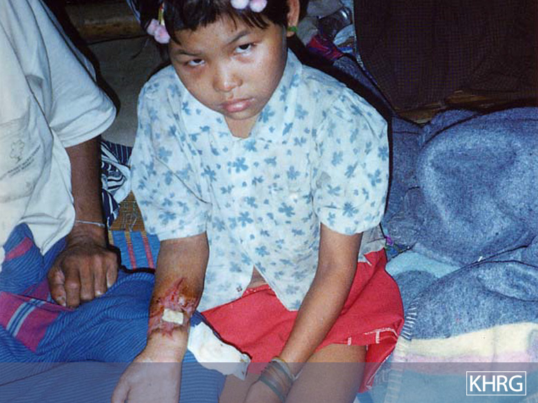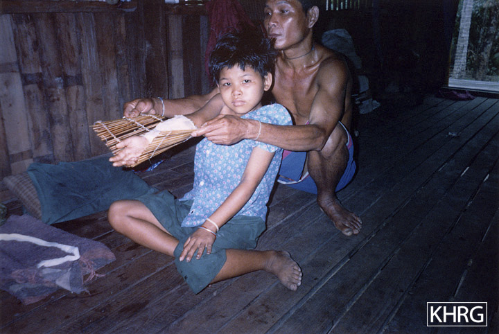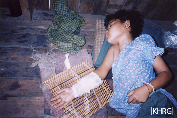 Photos #5-67, 5-68, 5-69, 5-70, 5-71, 5-72: These photos follow on from photos #D4-D7 in KHRG Photo Set 2002A . After being ordered to relocate along with other villages in Kya In township of Dooplaya district in April 2002, a group of villagers from Tee Law Bler tried to flee to Thailand. On April 28 th 2002 soldiers of SPDC IB #78, Battalion Commander Myo Htun Hlaing commanding, found them sleeping in farmfield huts not far from their village, surrounded the huts and opened fire, killing ten and wounding nine more. Six of those killed were children, four of them under the age of ten. All of those who survived the incident later arrived at Noh Po refugee camp in Thailand. Photo 5-67 shows U K---, 44, with his two surviving children, nine-year-old Saw N--- (left) and twelve-year-old Naw K--- (right). Photos 5-68 and 5-69 show the injuries to Saw N---'s arm from the shooting. The bullet penetrated his upper arm, shattering the bone. Photos 5-70 , 5-71 , and 5-72 show Naw K---'s wounds to her right forearm, and the homemade splint she was using. Their father told KHRG researchers: "We fled before the Burmese [soldiers] arrived. I fled with my wife and children to our field hut. We planned to go to Noh Po [refugee camp] in the morning, but before we could, they came and attacked us in the night time. It was about 10:00 or 12:00 [o'clock] when they attacked us. They shot at my hut and my brother's hut. They continued shooting for about five or six minutes. ... Three people in my family died and two were wounded. My wife was wounded but died 12 days later. Ten days after she was wounded she gave birth [the baby did not survive], but two days she later also died. ... I don't know why they wouldn't allow us to leave [to the refugee camp]. Maybe they thought that we would leave our children in Noh Po and would go back to fight them. I think that they are afraid that other people and other countries would learn about them so they didn't allow us to leave." His wife Naw Pee Lee is shown in photos #D5 and D6 in KHRG Photo Set 2002A . [Photos: KHRG researcher]