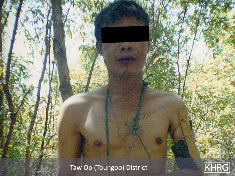 Photo #5-77: Saw S---, 46, from T--- in Toungoo District. He was shot in the arm by soldiers of SPDC IB #20 Column 3 without warning or provocation on March 27, 1993. He was staying in his farmfield hut when the soldiers saw him and opened fire. His arm has never fully healed; even a full decade after the incident when this photo was taken in February 2003, he still requires a bandage and sling. Since the shooting he has had great difficulty in performing his daily tasks as a hill field farmer. [Photo: KHRG researcher]