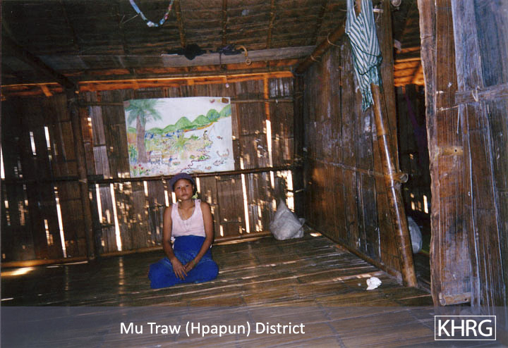 Photo #8-13: Naw S---, age 29, is from K--- village in Lu Thaw township, Papun district. In January 2004, SPDC troops from IB #60 found her living in hiding in the forest. They arrested her and took her and her three children to their camp at Pwa Ghaw. She was heavily pregnant, but the soldiers gave her and her children no food or rest along the way or when they reached the camp. Village elders of the nearby SPDC-controlled village of Pwa Ghaw managed to have her released and gave her rice, water, and clothing, but she had a miscarriage and almost died. She stayed with the villagers for 7 days, and then they took her back to the place where her husband was staying. Living back in the jungle without medicines, she fell ill and two of her three children got sick and died. She then fled to Thailand with her only remaining child, and arrived in February 2004 at the refugee camp where this photo was taken. The artwork behind her, depicting peaceful village life, was done by children in the refugee camp. [Photo: KHRG researcher]