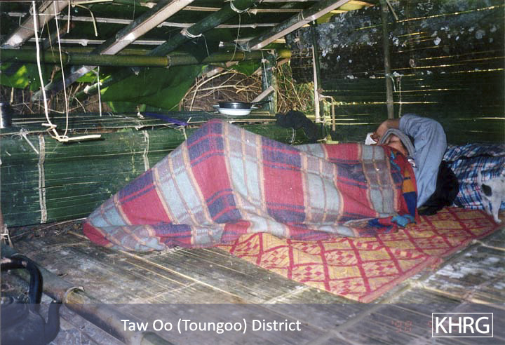 Photo #8-14: Naw T--- fled SPDC troops around her village in Tantabin township, Toungoo district and now lives in this shelter in the forest. When this photo was taken in February 2004 she had fallen seriously ill. There were no mobile medical teams in the area, so she had no access to treatment. [Photo: KHRG researcher]