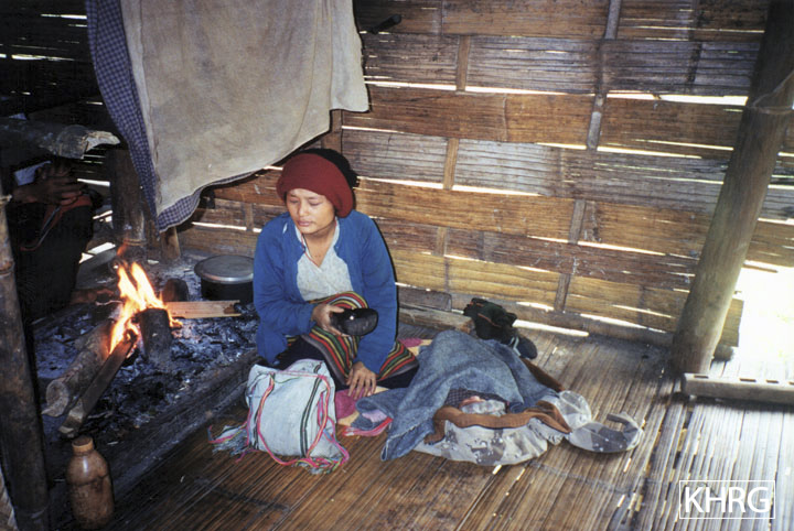 Photo #8-17: Naw H---, 28, from B--- village in Bu Tho township, Papun district, was about to give birth when SPDC LIB #434 troops came to her village on January 15 th 2003. She had to flee to this hillfield hut away from the village, where she immediately gave birth. This photo was taken three days later when she had made a fire to keep warm. [Photo: KHRG researcher]