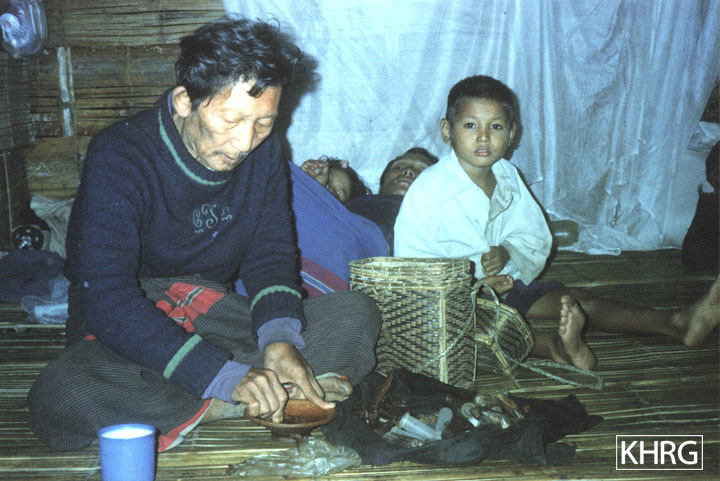 Photos #8-24, 8-25: In mid-2002, SPDC IB #78 (Battalion commander Myo Hlaing commanding) gave the people of Tee Law P'Leh village, Kya In township, Dooplaya district, only 4 days to move to Lay Wah Ka. Eight families comprising 33 people fled to Thailand instead. Naw S--- ( photo 8-24 ) gave birth in the jungle along the way. She and the others were dependent on Saw K---, 74, a traditional herbalist ( photo 8-25 ), to keep them going when they and their children got sick. Saw K--- is shown here preparing medicine. [Photos: KHRG researcher]