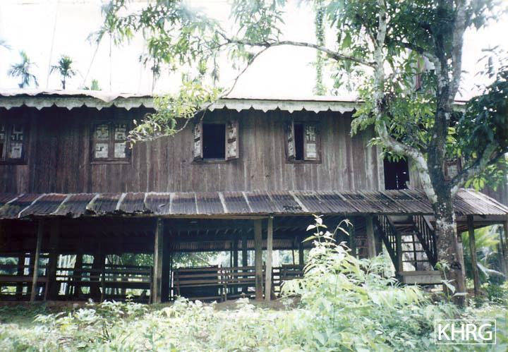 Photo #9-36: The Christian church in T--- village, Bu Tho township, Papun district. The space under the church operates as a village school. SPDC troops raided the village on August 15 th 2002 and remained in the village until August 28 th . All the villagers fled and did not dare attend either church or school during that time. This photo was taken two days after the SPDC soldiers had left, but the villagers still did not dare return. Schools throughout Papun district frequently have to close in conditions like these, making education a difficult and interrupted process. [Photo: KHRG researcher]