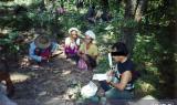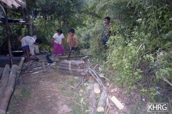 Photos # 10-154, 10-155, 10-156: Schoolteachers and students from S--- village middle school in Toungoo district. On December 18 th 2004, a column from SPDC LIB #590 (Battalion Commander Ko Ko Oo commanding) based at Tha Aye Hta marched through several villages in the area, so the villagers fled to the forest around B---. Photo 10-154 shows local schoolteachers planning how they can teach in hiding in the forest. Photo 10-155 shows middle school students preparing their lessons, and photo 10-156 shows them eating together beside their makeshift sleeping shelter. Continuing school activities is one way Karen displaced people retain dignity and community while on the move. Photos #1-52, 1-53, 1-54, 1-55: The primary schools in Khaw Hta and Yah Aw villages, Nyaunglebin district, were among the buildings burned by SPDC troops from LIB #589 and LIB #350 at the start of December 2004. Photo 1-52 shows the remains of Khaw Hta school a few days after it was burned. The people of both villages fled into the forest, where within a few days the schoolteachers had set up makeshift blackboards ( photo 1-53 ) and students from both villages tried to continue learning ( photos 1-54 and 1-55 ). [Photos: KHRG researcher]