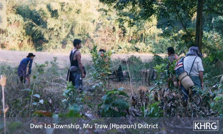 Photos #2-1, 2-2, 2-3: In January 2005, local SPDC officers ordered the people of K--- village in Dweh Loh township, Papun district to cut teak logs and float them downriver to the SPDC Army camp so the officers could sell them. The villagers failed to comply, so on January 25 th 2005 SPDC soldiers came to their village and started firing off their guns. The villagers ran in all directions; these photos show a group of them hiding in some bushes outside the village, checking to see if any soldiers are following them. [Photos: KHRG researcher]