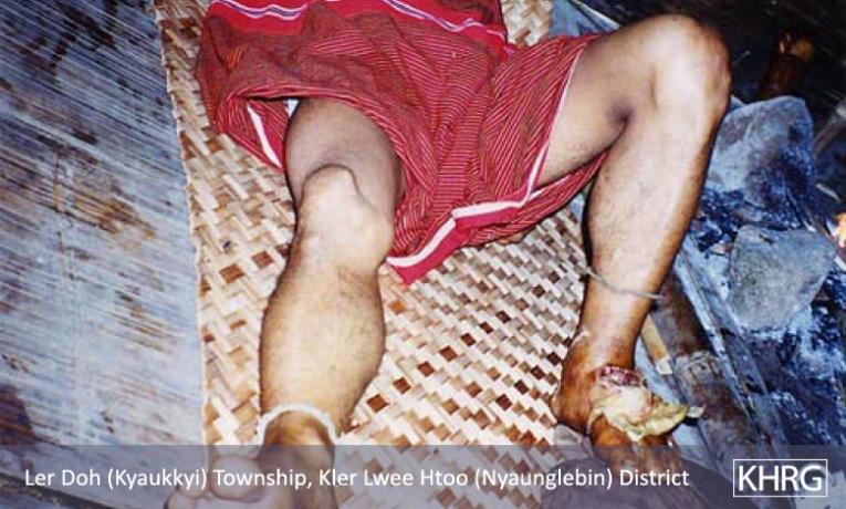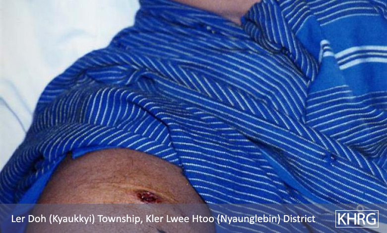 Photos # 5-52, 5-53, 5-54, 5-55, 5-56, 5-57: On August 28 th 2002 a mobile column of soldiers from SPDC LIB #366, LIB #367, and LIB #368 led by officers Soe Lwin, Myo Aung, and Maung Maung Oo came to M--- village in Ler Doh township of Nyaunglebin District and opened fire indiscriminately at the villagers. No KNLA troops were in the village, and all the villagers tried to flee. Photos 5-52 and 5-53 show Saw W---, 29, who was wounded in the foot. Photos 5-54 and 5-55 show 18-year-old Saw K---, who was wounded in his chest, his back, and his thigh. Photo 5-56 shows the grave of Naw Meh Leh, 29, a widow who was shot dead. Her brother returned to the village to bury her two days later, only to find her naked and that the soldiers had cut off her ears and one of her hands. Photo 5-57 shows her six month old son, Saw N---. His grandmother must now look after him. [Photos: KHRG researcher]
