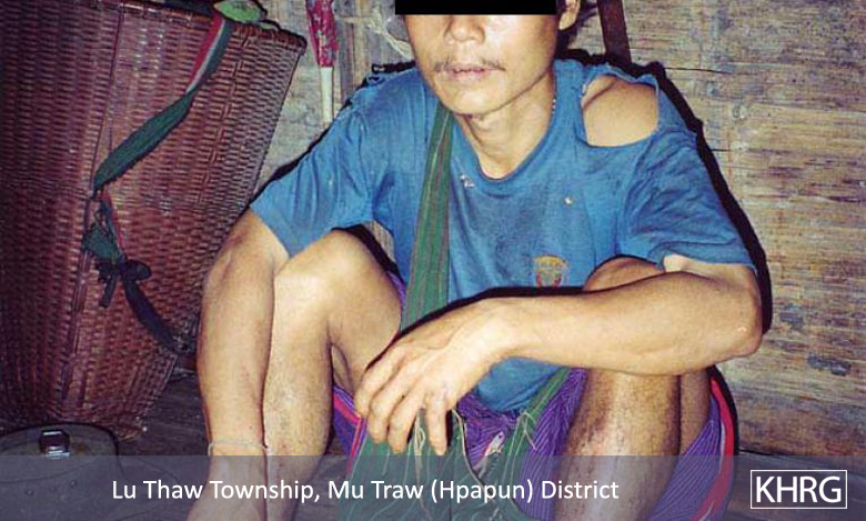 Photos #5-64, 5-65, 5-66: Eastern Lu Thaw township of Papun District is a hill region which the SPDC has been trying to depopulate since 1997 by relocating and destroying villages and shooting villagers on sight. On May 8 th 2002, a combined column of SPDC LIB #366 and LIB #369 entered T--- village without warning and opened fire on the villagers. Photo 5-64 shows Saw M---, 67, who says he was lucky to escape with his life. His son Saw Pleh, however, was shot dead. Naw Y---, age 22 ( photo 5-65), lost her mother and her younger sister Yeh Pu Day during the shootings. The next day the column went to D--- village and opened fire on the villagers there. Forty year old villager Saw T--- ( photo 5-66 ) sustained bullet wounds to his arm and abdomen. One of his friends was also killed in the incident. These photos were taken in August 2002. [Photos: KHRG researchers]