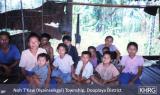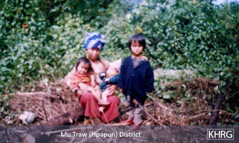 Photo #2-20: At 11 p.m. on March 27 th 2003, a bomb exploded in the vehicle garage at the camp of SPDC LIB #434 in Bu Tho township, Papun district, destroying the garage and two vehicles. The Battalion responded by shelling the nearby villages without warning. Most of the women, children and elderly villagers ran into the bunkers they have dug beneath their houses for use in situations like these. Adolescent and adult men, however, were afraid to be caught in the village by SPDC troops and accused of planting the bomb, so most of them fled into the forest, including this group from S--- village. This photo was taken on April 2 nd 2003, when the men were still afraid to return to their village. The women must therefore care for the children and elderly in the village and possibly also send food to the men in hiding. If troops come to the village, they must face them even though they may be accused as 'wives of rebels' because their men are missing. [Photo: KHRG researcher]