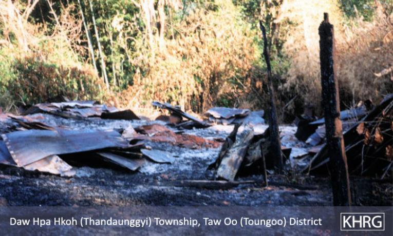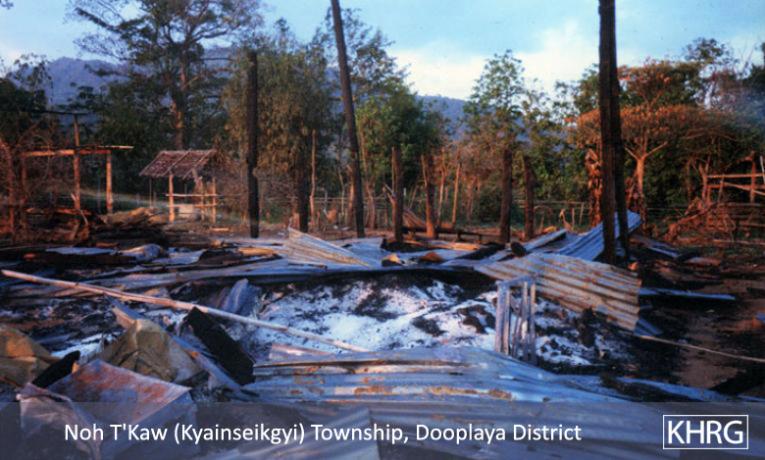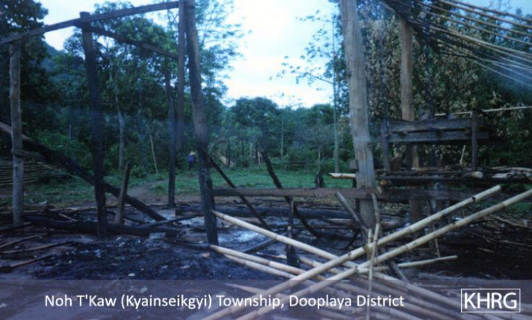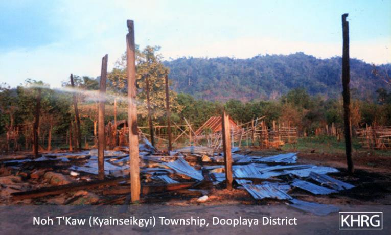Most of the photos in this section document the SPDC Army's attacks on undefended villages with the objective of bringing the population under control (for example, photos 1-1 to 1-3 and 1-23 to 1-26 ). In some cases, these are preceded by the issuance of forced relocation orders warning villagers to move to SPDC-controlled sites within one to two weeks or be killed ( photos 2-37 to 2-40 and 2-41 and 2-42 ; see also Section 3 [ Forced Relocation and Restrictions ] ). Often, though, a heavily armed SPDC column of 300-400 troops moves into the area to be 'cleared' and attacks villages one by one without warning, firing on the village while the villagers flee and then looting and burning the houses. In such cases, villagers found still in the village are often shot (see photos 5-6 to 5-8 , 5-52 to 5-57 , and 5-64 to 5-66 ). The column particularly targets food supplies needed by villagers to survive ( photos 1-1 to 1-3 and 2-31 to 2-36 ), their farmfields and farming huts ( photo 2-12 ), and the schools, churches and temples which are centres of community solidarity ( photos 2-11 and 2-37 to 2-40 ). The soldiers loot the village while destroying it ( photo 7-79 ), and often lay landmines before leaving to prevent villagers from returning to rebuild ( photos 1-27 and 2-15 to 2-17 ). Local SPDC-allied armed groups like the Democratic Karen Buddhist Army (DKBA) and Karenni Solidarity Organisation (KnSO) sometimes assist SPDC forces in these attacks (see photos 2-4 , 2-21 , 2-28 and 2-29 , and 2-30 , and 10-5 and 10-6 ).
