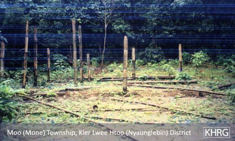 Photo #2-14: SPDC soldiers from IB #5 under battalion commander Ko Ko Naing built a temporary Army camp adjacent to the irrigated paddy fields of Htee Baw Law village in Dweh Loh township of Papun District. On May 15 th 2003, the soldiers entered the village and stole the thatch from the roofs of the villagers' homes for use in the construction of the camp. This photo was taken in July 2003. [Photo: KHRG researcher]