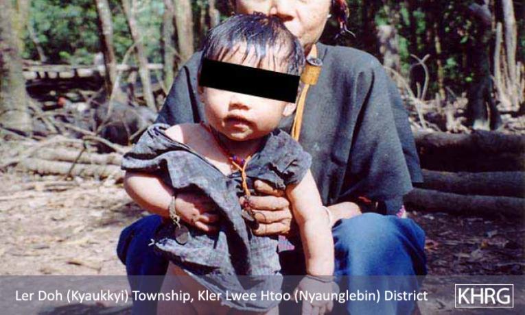 Photos #10-116, 10-117: Children in Kyauk Kyi (Ler Doh) township, Nyaunglebin district, move through the forest with their families in October 2002 after SPDC units burned their farmfield huts and came to their villages. These children from Dta Kaw Der village were fleeing through the forest on October 9 th 2002 after SPDC troops had destroyed their village. See also photo 10-115 . [Photos: KHRG researcher]