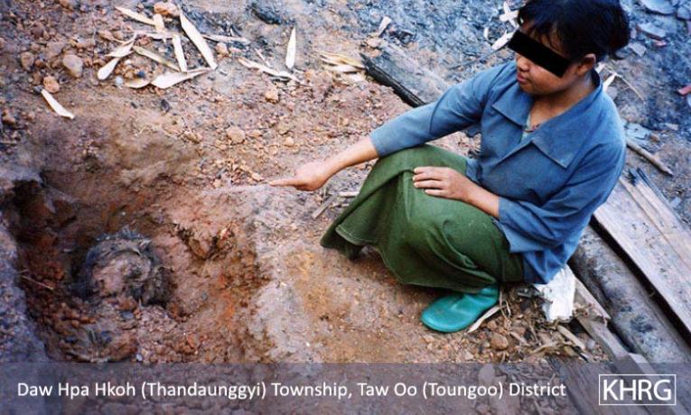 Photos # 5-6, 5-7, 5-8: When they arrived to burn M--- village in Than Daung township on December 19 th 2003 (see photos above ), Nyunt Win's LIB #509 troops saw 20-year-old male villager Saw Ko Lah in the village. They shot him dead on sight, then buried his body by the smouldering remains of one of the buildings that they had torched; photo 5-6 shows his head in his partly exhumed grave. Photos 5-7 and 5-8 show his 17 year old sister Naw P--- beside his grave. These photos were taken in January 2004. [Photos: KHRG researcher]