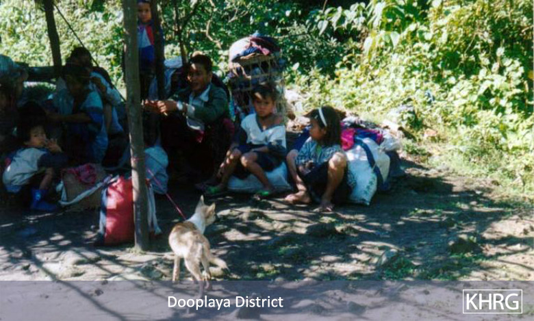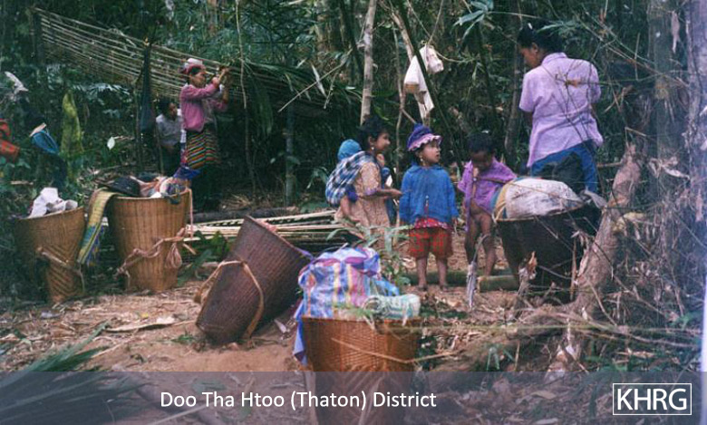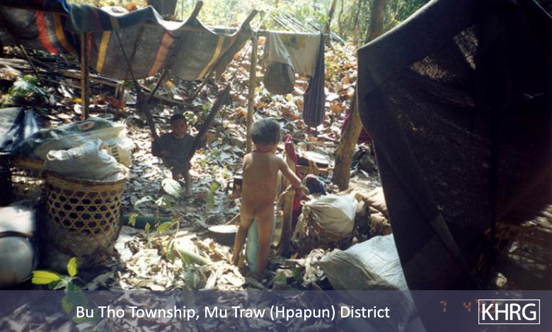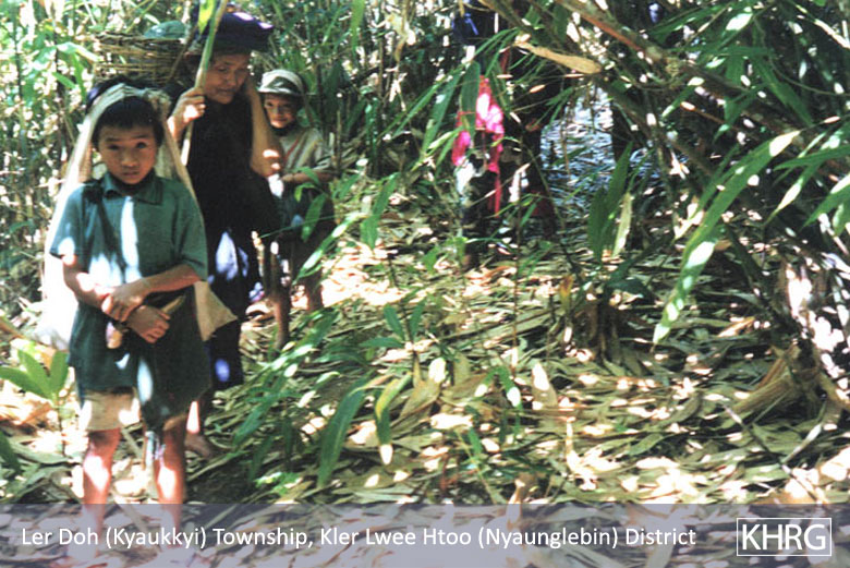 Photo #10-115: Internally displaced villagers from Thaw Ngeh Der village in Ler Doh (Kyauk Kyi) township of Nyaunglebin District. As a part of the SPDC's ongoing campaign to depopulate the hills of Nyaunglebin District, on October 5 th 2002 soldiers from LIB #175 entered their village and burned it to the ground, while all the villagers fled into the forest. This is not the first time that this had happened; three and a half years earlier in May 1999, a column of soldiers from IB #48 and IB #26 had done the exact same thing, burning the village and all food supplies to the ground. Theirs was only one of a dozen such villages that were destroyed. Over the past twenty years many villagers in Karen regions have gone through repeated cycles of village destruction by SPDC forces, life displaced in the forests, and gradual re-establishment of their villages only to have them burned again. This photo was taken three days after the attack on their village, when the people were returning to the village to rebuild their homes. See also photos 10-116 and 10-117 . Photos #10-116, 10-117: Children in Kyauk Kyi (Ler Doh) township, Nyaunglebin district, move through the forest with their families in October 2002 after SPDC units burned their farmfield huts and came to their villages. These children from Dta Kaw Der village were fleeing through the forest on October 9 th 2002 after SPDC troops had destroyed their village. See also photo 10-115 . [Photos: KHRG]