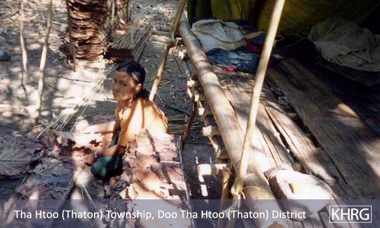 Photos # 10-134, 10-135, 10-136, 10-137, 10-138: These villagers in Thaton township of Thaton district left their villages to escape excessive demands for forced labour, money and goods from SPDC and DKBA forces in their area, and now live in the forest where these photos were taken in February 2005. To survive they make and sell roofing thatch. The girl in photo 10-135 has just set down a large basket used to gather leaves for thatch-making. The woman in photo 10-134 is shaving bamboo to make sticks for frames and ties to weave the shingles together, which is being done by the woman in photo 10-136 . In most of the photos, piles of leaves and completed thatch shingles can be seen surrounding the villagers. Each day they must make hundreds of these shingles just to make enough to buy daily rice. It is also a dangerous living; if found living here in the forest by an SPDC or DKBA patrol, they would be rounded up and taken to an Army camp for an indefinite time doing forced labour. [Photos: KHRG]