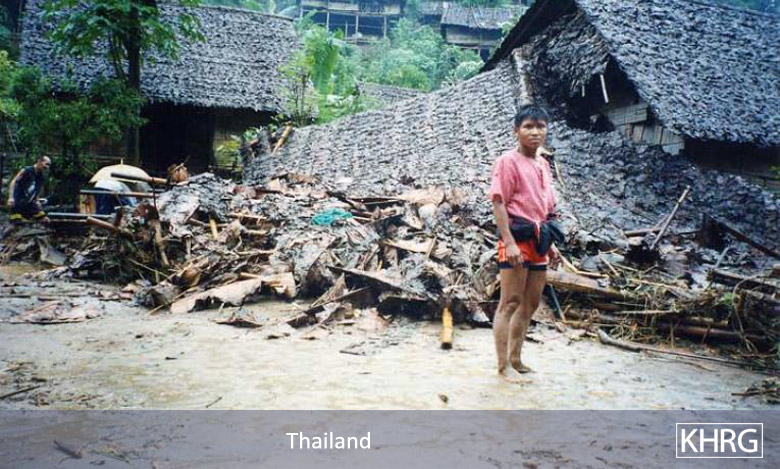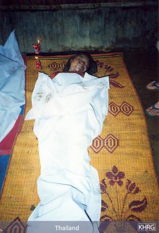 Photos #10-182, 10-183, 10-184, 10-185, 10-186, 10-187, 10-188, 10-189, 10-190, 10-191, 10-192, 10-193, 10-194: Villagers who manage to cross into Thailand, avoid forced repatriation by Thai authorities, and find their way into a Karen or Karenni refugee camp are still not safe. Since 1995, Thai authorities have consolidated the refugee camps and progressively moved them closer to the border (contrary to established UN refugee guidelines) and onto more unstable and unlivable terrain, as part of a deliberate policy to make life difficult and dangerous for refugees in the hope that they will decide to return to Burma instead. One result has been attacks by Burmese forces on unprotected refugee camps; another has been deaths by natural disasters due to the placement of refugee camps in steep and unstable gullies. On September 2 nd 2002, flash floods swept away houses in Meh Ka Kee (Mae Khong Kha) Karen refugee camp opposite northern Pa'an district, killing at least nine refugees. Photos 10-182 through 10-184 show the waters raging through the camp. Photo 10-185 shows all that remains of a house that stood in the way, and photo 10-186 shows the remains of the barracks for newly arrived refugees. Those killed included Naw Lah May, 17 ( photo 10-187 ); Saw Tah Pu Lu, 14 ( photo 10-188 ); Saw Hsa K'Pru, 26; Saw Kyaw Ta Muh, 19 ( photo 10-189 ); Naw Wah, 12 ( photo 10-190 ); Naw Lay Way Paw, 18 ( photo 10-191 ); Naw Mu Si Si, 10 ( photo 10-192 ); Saw Johnson Mu, 19 ( photo 10-193 ); and Saw Kyaw Htoo, 49 ( photo 10-194 ). The camp is built along steep and narrow gullies extremely vulnerable to flash floods and landslides. Making matters worse, when floodwaters rise Thai authorities sometimes open the dam upstream at Mae Sariang without notifying villagers or refugees downstream. This has caused deaths in villages near Meh Ka Kee in the past, though it is not confirmed whether it happened in this case. [Photos: KHRG]