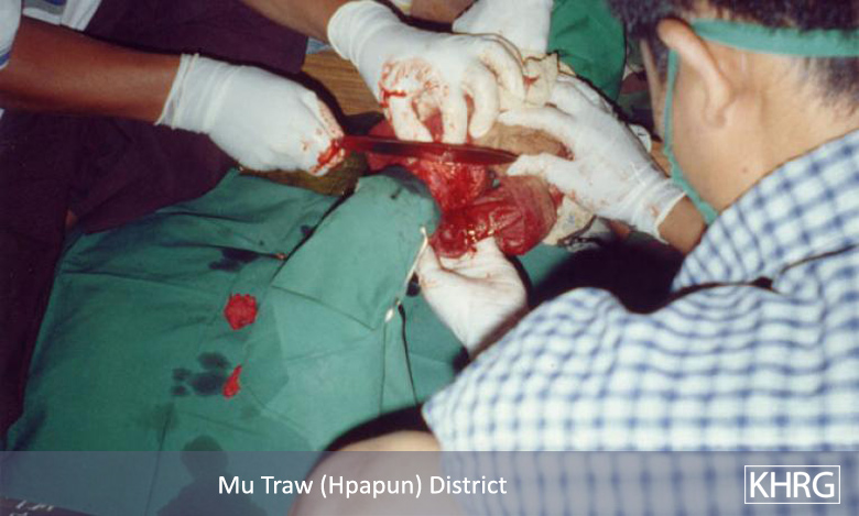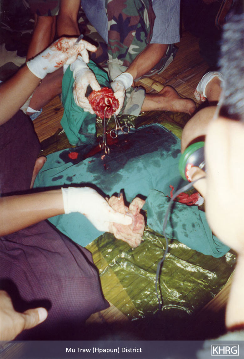 Photos # 11-32, 11-33, 11-34, 11-35, 11-36: On August 11 th 2003 Saw H---, a 17-year-old from B--- village in southern Karenni (Kayah) State, stepped on a landmine planted near his village by SPDC-allied Karenni Solidarity Organisation (KnSO) soldiers commanded by officer Hsa Wah. It was not until two months later that he reached this KNU clinic in Papun District, where this photo was taken. The medics decided his lower leg (shown in photo 11-32 ) could not be saved. The remaining photos show stages of the amputation, which is done with only the simple medical tools available and without general anaesthetic. Many of those who step on landmines die from loss of blood or shock long before they can be either taken to medical care or wait until it reaches them. KnSO mines are also involved in photo 11-19 above . [Photos: KHRG]