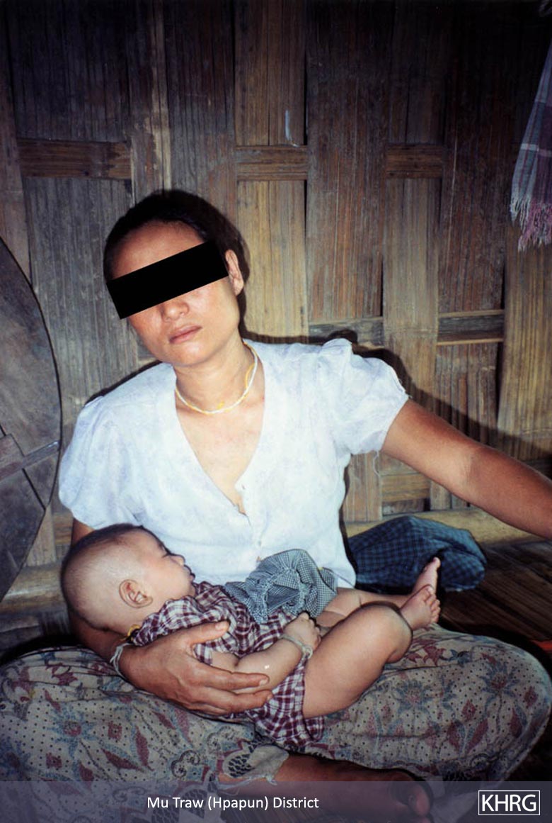 Attempts by SPDC columns to force villagers out of hill areas have a dire effect on maternal and infant mortality and morbidity. When villagers have to stay on the move to avoid these columns, infants cannot be properly cared for (see photos 8-10 to 8-12 ) and women giving birth must do so in unsanitary conditions with no outside help. Unable to flee when the columns approach, women giving birth or with newborns but sometimes remain behind to face the soldiers alone (see photo 2-30 ). Children with disabilities also have difficulty fleeing with the other villagers, so their parents remain behind with them to face the soldiers (see photo 10-148 ). The lack of sufficient nutritious food resulting from a life on the move and SPDC destruction of rice supplies lead to maternal and infant malnutrition (see photos 8-21 to 8-23 ), and many children die before age five. Those who survive beyond that age must then face the threats of SPDC violence against children and forced labour which were discussed in earlier sections.