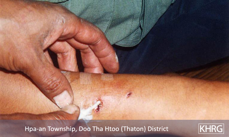 Photos #5-33, 5-34, 5-35, 5-36, 5-37, 5-38, 5-39, 5-40: On October 30 th 2002, a number of villagers from S--- village in northern Lu Thaw township, Papun District, went to harvest the paddy from their hill field at T---. SPDC forces have been trying to depopulate this hill area since 1997 by destroying villages, crops and food supplies and shooting villagers on sight, but thousands of villagers still survive here. At 3:30 pm as the villagers were collecting their harvest, soldiers from LIB #235 crept up on them and opened fire. One of the villagers, 25 year old Saw Ray Bee Wah, was shot dead, and at least five other villagers were injured in the shooting. Photos 5-33 , 5-34 , and 5-35 show Naw L---, 15, who was shot just below her left elbow. Photos 5-36 and 5-37 are of eight-year-old Naw M---, who was shot in the abdomen, the bullet barely missing her kidney. Photos 5-38 and 5-39 show the gunshot wound in the leg of Saw T---, 38. Fortunately for him, the bullet passed right through his leg without hitting the bone. Photo 5-40 shows Saw T---, 20 years old, who was shot in the forearm, having his wound cleaned by a Karen medic. Medics in the area can do little but clean the wounds due to the lack of medicines and clinic facilities. Saw P---, a 32-year-old villager not shown here, was also wounded. The reason so many people were hit is that they must harvest in open hillside fields with no cover, while SPDC troops can creep up in the forest to the very edge of the field without being detected. In these circumstances there is no doubt that they knew they were firing on civilians and children. These photos were taken in November 2002. [Photos: KHRG]