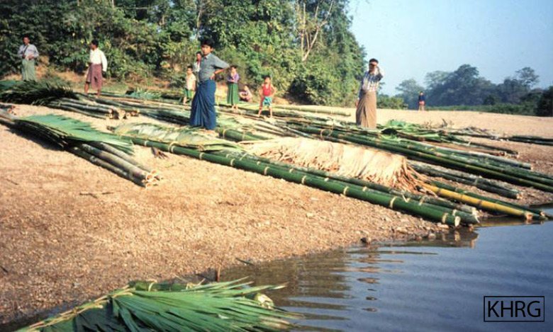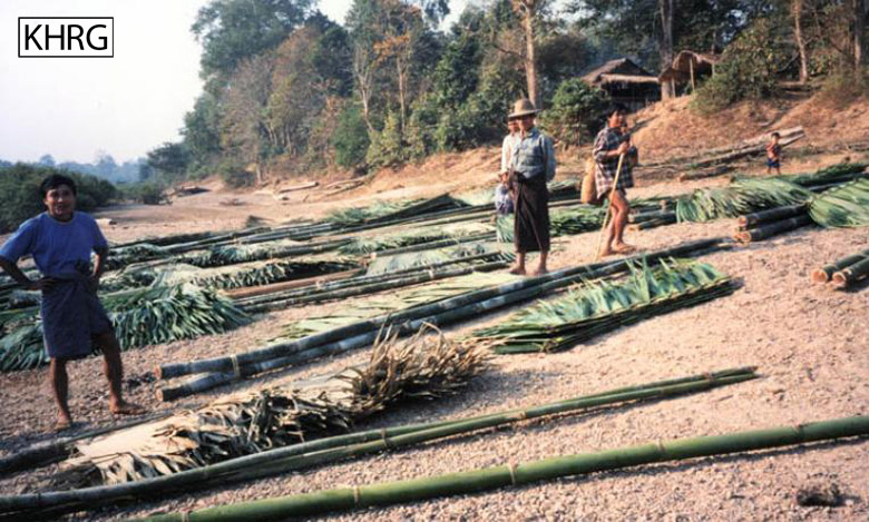 Photos # 6-228, 6-229, 6-230, 6-231, 6-232, 6-233, 6-234, 6-235, 6-236: Throughout January 2004, commander Zaw Lwin Htut of LIB #349 demanded large quantities of bamboo and roofing thatch from numerous villages in Dweh Loh township of Papun District. Each household in all of these villages was ordered to deliver six lengths of bamboo and five shingles of thatch to the Win Maung SPDC Army camp adjacent to the Wah Mu relocation site. Saw S---, 29, from P--- village told a KHRG researcher, " I had to go to send six pieces of bamboo and five shingles of thatch to the SPDC at Wah Mu. They are from LIB #349. The name of their commander is Zaw Lwin Htut. They didn't pay us; they forced us to work. If the people don't work they won't allow them to stay in the village. They said that people who don't go to do loh ah pay , portering, or set tha are not villagers [i.e. that they must be rebels]. If the people don't work they have to hire someone [itinerant labourers], and if they don't hire labourers then they have to leave." The villagers were not paid, nor were they provided with any tools or even food. Providing these materials is labour intensive. Photo 6-228 shows a villager from K--- village cutting fronds that will be used to make the thatch from his plantation of Loh (Cabbage Tree palm) trees. Bamboo must be cut in the forest, then split and shaved to make the frames for the thatch shingles. Photos 6-229 through 6-233 show people representing each house in K--- and M--- villages carrying their quota of thatch and bamboo to the Bilin river to be transported to the Army camp. At the riverbank the materials from several villages are laid out in piles so village leaders can count them (photos 6-234 and 6-235 ); if on arrival at the Army camp they are found to be one household short of the quota, the entire village will be punished. In photo 6-236 , one of many rafts sets out to deliver the materials to the Army camp. These photos were taken between January 8 th and 27 th 2004. Thatch is often demanded by Army camps to repair their own buildings, but when such large quantities are demanded it is possible that the SPDC officers plan to sell it for personal profit. Photos 6-237 through 6-240 in Section 6 and 6-248 through 6-250 below suggest that this may be the case, because they show that Wah Mu army camp demands large quantities of these materials from the villagers at least once every 3 months. [Photos: KHRG]