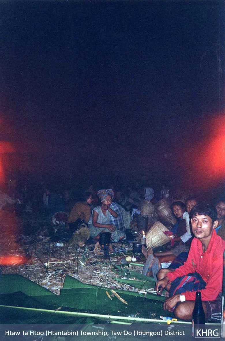 Photos #6-25, 6-26, 6-27, 6-28, 6-29, 6-30, 6-31, 6-32, 6-33, 6-34: Villagers in Tantabin township, Toungoo District during two solid weeks of forced labour. On April 1 st 2003, Operations Commander Khin Maung Oo of the SPDC's Southern Command ( Ta Pa Ka ) Strategic Operations Command #3 issued orders for 1,000 villagers from SPDC-controlled villages in the Kler Lah and Kaw Thay Der areas to porter supplies from Kler Lah to Tha Aye Hta Army camp, in order to stockpile enough rations and supplies at Tha Aye Hta in preparation for the coming wet season. Sein Than, commanding officer of IB #75 Company #4 based at Yay Tho Gyi Army camp in Kaw Thay Der, was responsible for rounding up many of the villagers for this labour. It is a six-hour walk from Kler Lah to Tha Aye Hta. For the first two weeks of April, approximately 1,000 villagers had to carry loads in shifts along this route, which is part of the Toungoo – Mawchi vehicle road (see map ). While some villagers carried, others were forced to work clearing the bush along both sides of the road to protect SPDC columns from ambush. These photos taken between April 7 th and 12 th show the villagers travelling up and down the road with loads of Army rations, tools for roadside clearing, and their own food and other supplies. The villagers shown here are from Kler Lah, Kaw Thay Der, Ler Ko, Klay Soe Kee, Wa Tho Ko, and Maw Ko Der villages. Women made up a large portion of the workforce, and there were also children (see photo 6-25 ). They had to bring all their own food and tools, and were paid nothing. The bamboo handles protruding from baskets in photo 6-30 are the handles of their machetes, and in photo 6-25 one man can be seen carrying a two-person saw over his shoulder for clearing trees. Photos of villagers doing clearance work could not be taken because this was done under the watch of SPDC soldiers. The truck in photos 6-31 and 6-32 is owned by 55-year-old villager Saw T--- from K--- village. He was ordered to transport 40 sacks [2000 kg. / 4400 lbs.] of rice from Toungoo town to the Army camp at Tha Aye Hta without payment, not even compensation for the cost of the petrol. In the photos, villagers portering loads are trying to hitch a ride on the truck. Photos 6-33 and 6-34 show a group of villagers bedding down for the night along the roadside, some using their baskets as pillows. [Photos: Tantabin township villagers, assisted by KHRG researcher]
