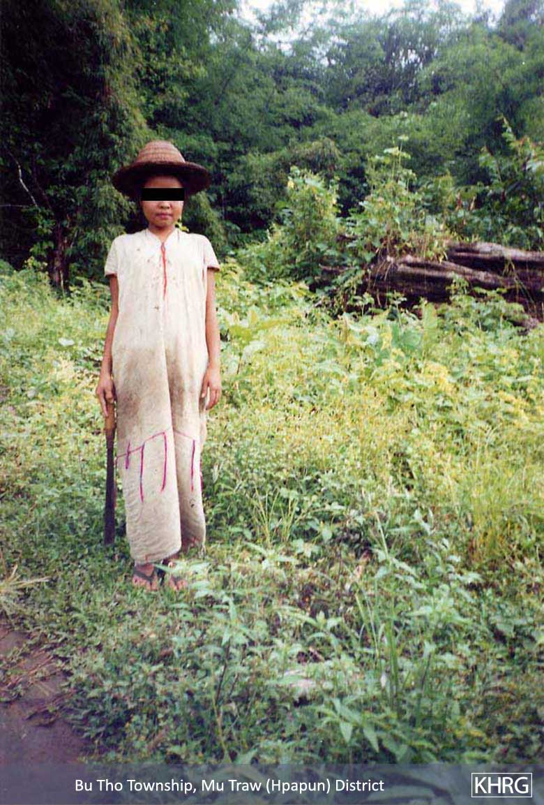 Photos #5-20, 5-21, 5-22: Saw Pa La Day, 50, from T--- village in Bu Tho township of Papun District was shot dead on sight by soldiers from SPDC Light Infantry Division #66 on May 30, 2003. His wife, Naw T--- ( Photo 5-22 , which has been damaged), must now raise their three young children alone. The SPDC has been trying to depopulate the hills of Bu Tho township since 1997 by burning villages and shooting villagers on sight. These photos were taken in June 2003. Photo #4-13: Naw N--- is a 33-year-old widow from W--- village in Bu Tho township of Papun District. On May 5 th 2003, soldiers from LIB #434 led by Myo Myint Hlaing were ambushed by KNLA soldiers not far from her village. The soldiers then entered the village and arrested Naw N---'s husband, 41 year old Pa M---, and accused him of complicity in the attack. Arbitrarily arresting local fighting-age male villagers in retaliation for ambushes is a routine SPDC Army procedure. During his interrogation at the SPDC Army camp nearby, Pa M--- was kicked, strangled, hung, stabbed in the legs with knives, and beaten to death. Their eldest daughter, 13 year old Ma M---, had to drop out of school in order to find work to help her mother raise money to support the family. This photo was taken in July 2003. [Photos: KHRG]