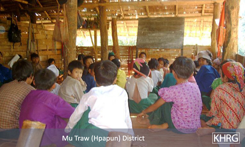Karen students studying in a village middle school, Lu Thaw township, Papun district. These schools are often targeted for destruction because they are not SPDC-controlled, and they often have to close when SPDC troops are active in the area and villagers have to go into the forest. The second Photo shows the primary school at L--- in Papun district in August 2005. The villagers run this school themselves with local teachers and little outside support. The school is close to an army camp occupied by SPDC Infantry Battalion #42, so it frequently has to close. The last photo shows Students and the teacher of Hee Ko Theh primary school in Papun district pose in front of their school. This school can only open when there is not much SPDC activity in the area; some years it is entirely closed. In difficult times parents need their children to care for younger siblings and do other work for the family, and may only feel able to spare one child for schooling – in such situations it is usually boys who are sent to school, as reflected in the high proportion of boys in this photo. [Photos: KHRG]