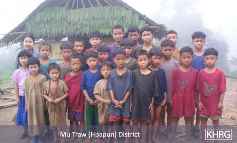 Children in H--- village, Dweh Loh township, Papun district in May 2005. There is no school in their area so they cannot study. The SPDC does not support any schools nearby and if the villagers or the KNU try to establish schools they are deliberately destroyed by SPDC troops. [Photos: KHRG]