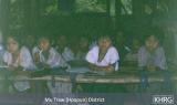 Students at Tee Mu Kee school in Lu Thaw township, Papun district, in June 2005. The school goes from kindergarten to high school (10 th Standard), but it gets very little outside support. Each student has to give 5,000 Kyat and one big tin (12.5 kg/27.5 lb) of rice per year to support the teachers. Many of the students hire themselves out for labour to get money for books and pens. The teachers receive only 120,000 Kyat (about US$120) per year, so they need to be supplied with food. This provides little incentive to finish high school and become a teacher. The last photo shows these children in Thay P'Kee Der village in Papun district say they would like to go to school, but there is no teacher so they cannot study. [Photos: KHRG]