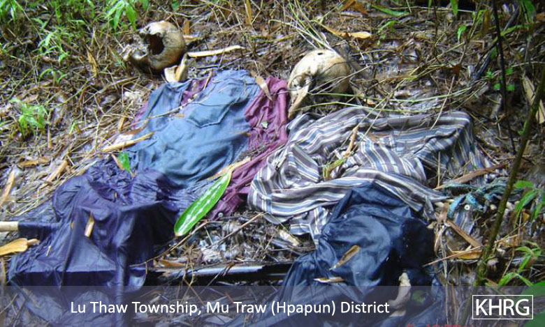 The body of a convict porter killed by SPDC troops from MOC #15 while operating around Dta Paw Der and Dta Meh Der villages in the Bilin River area, Lu Thaw township, Papun district. [Photo: KHRG] The decayed remains of another convict porter killed and left behind by SPDC soldiers in Lu Thaw township, Papun district. [Photo: KHRG]