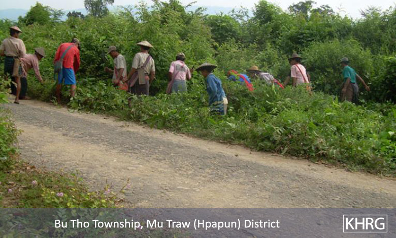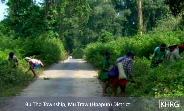 "We had to clear the vehicle road, the order was from [Light Infantry] Battalion #434. We had to clear the road between K--- and W---. We had to clear the road which was 50 feet wide [15.2 m.] and 2 furlongs long [402 m. / 440 yards]. Old and young people were also included. We were not guarded by them [SPDC soldiers] while we were clearing [the side of] the road. We had to bring along our own food. We did it [the forced labour] in one day. Mostly the villages such as Kler Koh, Gkaw Kee Law, Waw Koh, Dwee Koh, Khoo Tho Hta, Khaw Hta, Noh Waw Gkoo, Hta Poh, Gklaw Day and others which were situated along the road had to clear it."