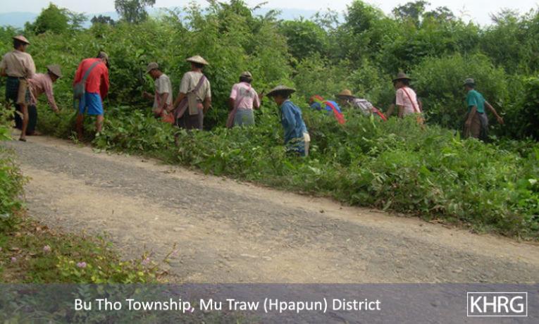 "They [SPDC soldiers] told us that they would repair the huts and fences of their military compound. Also the other villages which were near to their camp such as Gklaw Hta, Ku Baw Koh and Ka Dwee Koh had to do the same thing like us. We had to work for them without any payment. We have to cut bamboo poles and send thatch shingles three or four times in a year and we also have to clear [the side of] the road. Usually we have to clear it twice a year. Now we've had to start clearing the road on November 12th 2007. We've had to take a responsibility to start clearing the road between P--- and N--- villages."