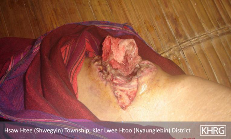 The first photo shows a 16-year-old Naw Th--- recovers on October 19th after having fled through the forest from SPDC soldiers who shot her in the arm. The second photo shows a 55-year-old Naw T--- from Htee Bla Kee village, Shwegyin township receives medical treatment on October 12th 2007 following an attack on her field hut by SPDC soldiers from LIB #217. The third photo shows Naw T--- managed to escape with her life but severe injuries to her knee and buttocks mean that she has so far been unable to walk or even stand. [Photos: KHRG]