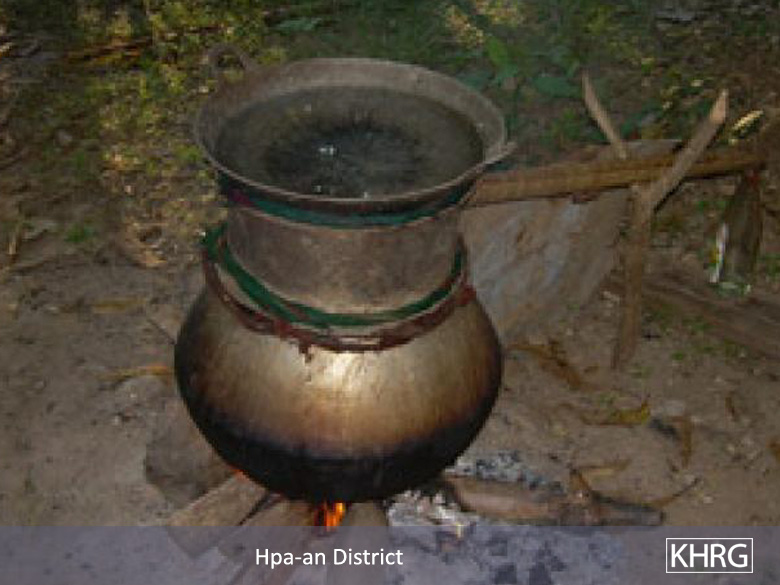 In this photograph, rice is being distilled into a local type of alcohol drunk by many Karen. At this time of year, as the Karen are harvesting their crops, it is custom to celebrate the end of the work period by drinking alcohol with friends and family. [Photo: KHRG]