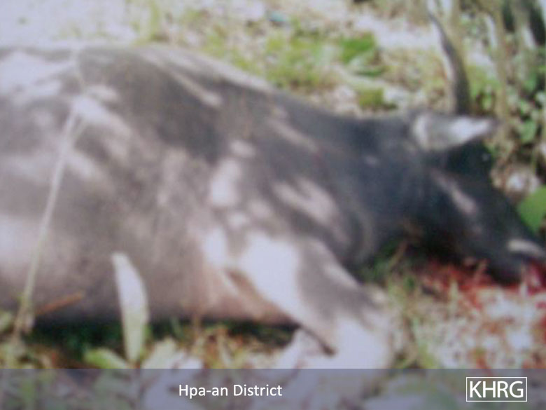This photo, taken on November 27th 2008, shows a water buffalo belonging to a villager in Dta Greh Township. The buffalo stepped on a DKBA-deployed landmine and subsequently died. [Photo: KHRG]