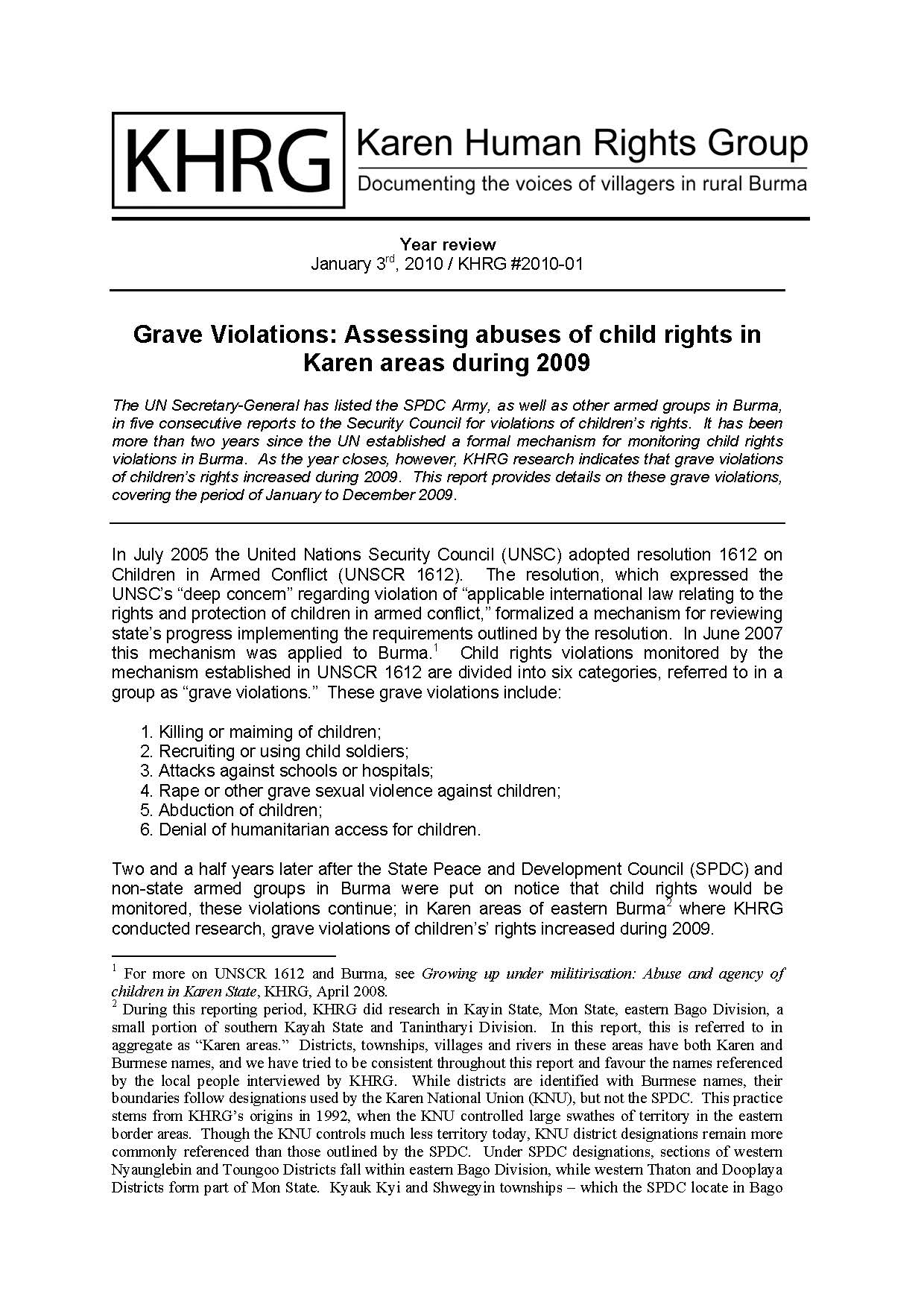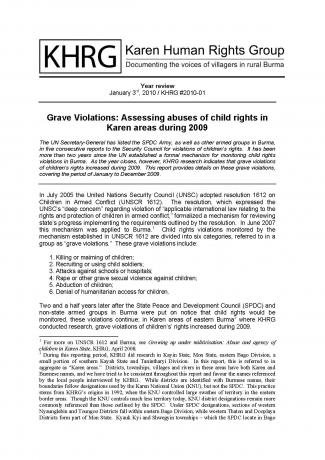 Two and a half years after the State Peace and Development Council (SPDC) and non-state armed groups in Burma were put on notice that child rights would be monitored, these violations continue; in Karen areas of eastern Burma where KHRG conducted research, grave violations of children’s’ rights increased during 2009. The following report provides information regarding child rights violations documented by KHRG during the period of January to December 2009. The report is organised into six sections, each corresponding to one of the grave violations covered by UN Security Council Resolution 1612. Trends are identified where possible. Conclusions about each reporting area are briefly summarised below: