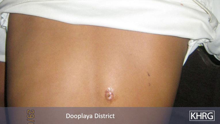 These photos, taken on April 29th 2011, show Saw T---, 17, displaying a burn scar on his back. Saw T--- was hit by a fragment from a rocket-propelled grenade that was fired during an April 24th clash between Tatmadaw IB #283 and DKBA soldiers near the road between T'Aye Shay village and Kyaikdon Town. [Photos: KHRG]