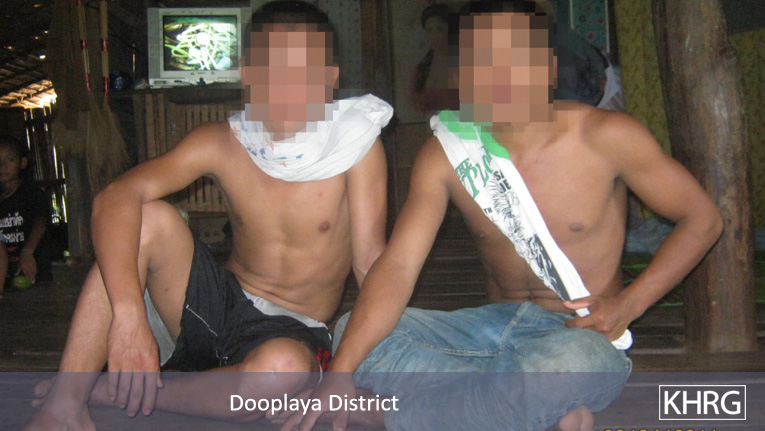 This photo, taken on April 29th 2011, shows Maung B---, 22, and Saw F---, 20, who sought refuge in Thailand due to fighting between Tatmadaw and DKBA forces near Wa--- village. Maung B--- told KHRG that he farmed a flat field in Wa--- before he fled. [Photo: KHRG]