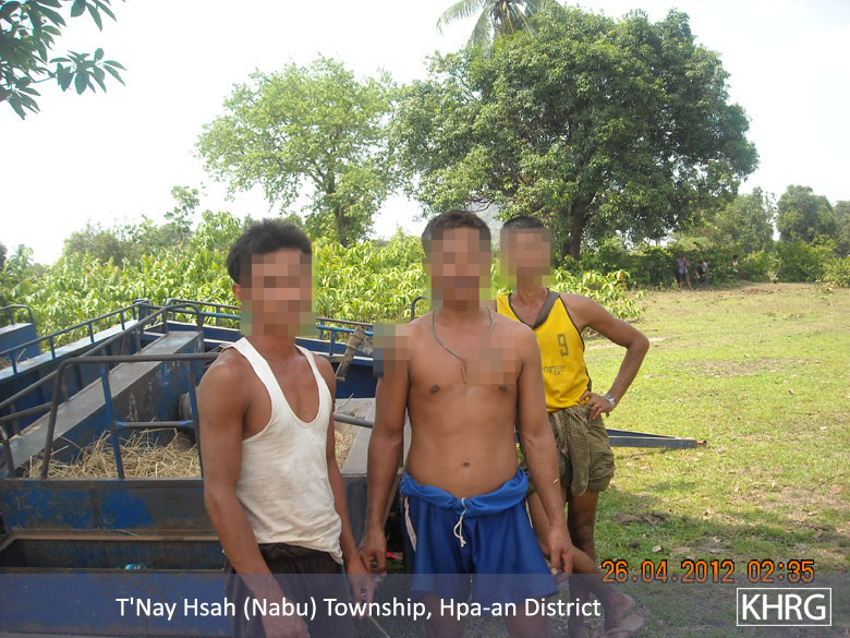 According to a local village head, during April 2012, Tatmadaw soldiers from Light Infantry Battalions (LIBs) #547, #548, and #549 ordered residents of Htee Hpoh Kyaw, Mya P'Deh and Noh Ta Pweh village tracts in T'Nay Hsah Township to bring 12 hand tractors from each village tract in order to plough a paddy field owned by the Tatmadaw.[4] The villagers from Htee Hpoh Kyaw village tract brought 12 hand tractors, the villagers from Mya P'Deh village tract came with nine tractors, while, the villagers from Noh Ta Pweh village tract came with only two hand tractors, making the task of ploughing the paddy field difficult.