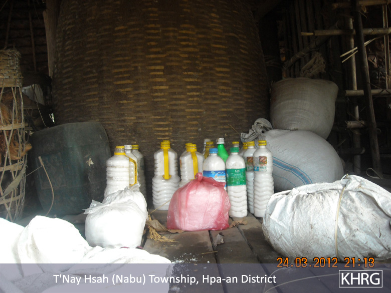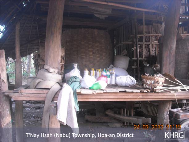 These photos were taken on March 24th 2012 in N--- village, T’ Nay Hsah Township, Pa’an District. It shows where villagers hid their rice, salt and other things when the KNLA and Border Guard were fighting on September 21st 2012. The villagers did not dare to keep their food inside their houses because they were worried that their village would be burnt down. The villagers came to this conclusion after the Border Guard soldiers threatened the villagers saying that “the N--- villagers were disobedient, so we will burn your whole village.”[Photos: KHRG]