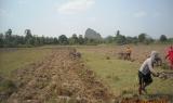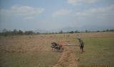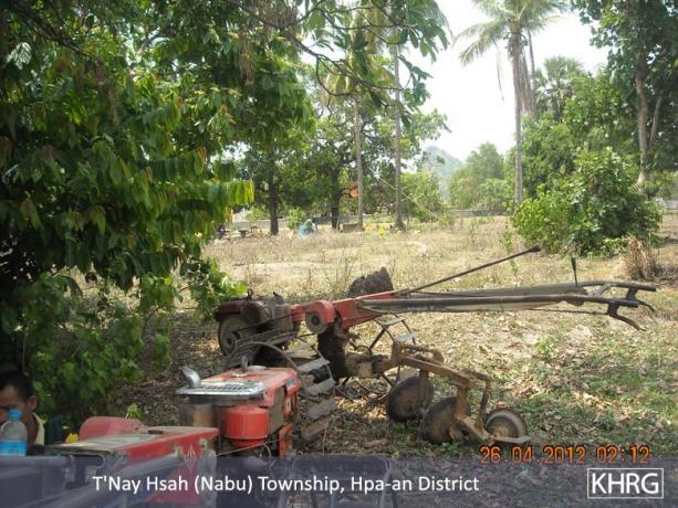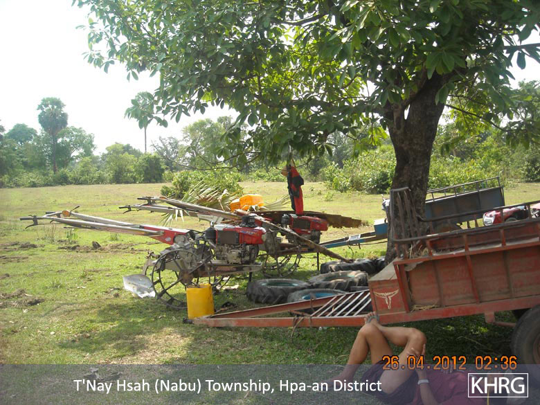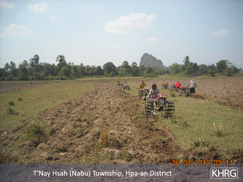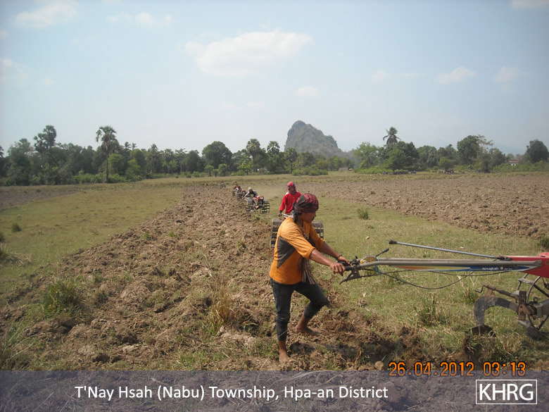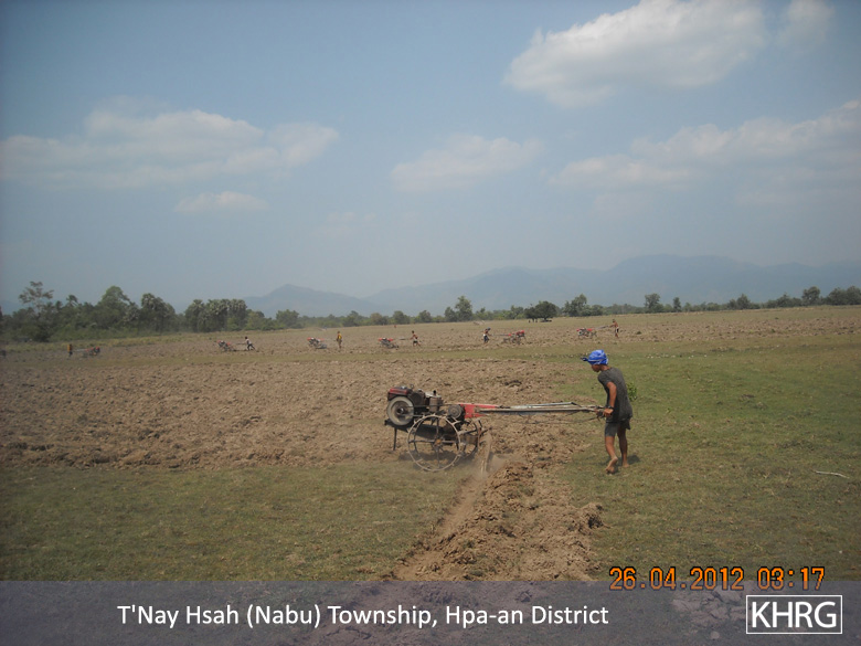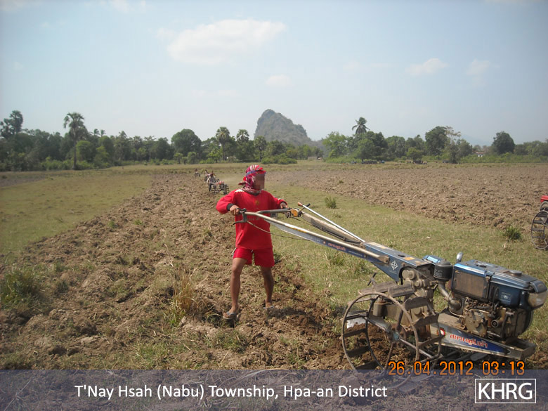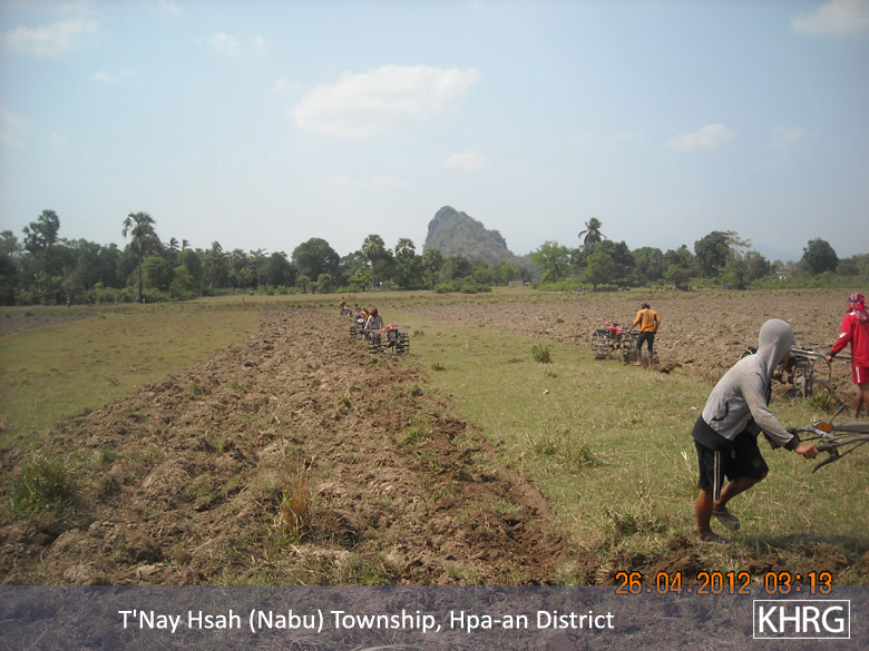 The above photos were taken on April 22nd 2012 in T’ Nay Hsah Township, Pa’an District. These photos show villagers ploughing paddy fields for the Tatmadaw. Villagers from three village tracts are shown in the photos, including Htee Hpoh Kyaw, Mya P’Deh and Noh Ta Pweh. Each village tract had to provide 12 hand tractors. However, villagers from Mya P’Deh village tract brought nine hand tractors and villagers from Noh Ta Pweh brought two hand tractors. The villagers who ploughed the fields for the Tatmadaw had to bring their own food and other necessary materials.[Photos: KHRG]