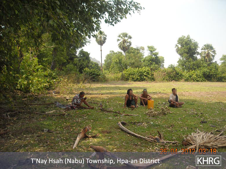 This report includes a situation update submitted to KHRG in May 2012, by a community member describing events occurring in Pa'an District during the period between September 2011 and April 2012. It describes the planting of landmines by Border Guard soldiers near Y--- and P--- villages, resulting in villagers from B---, N--- and T--- being injured, and some villagers committed suicide after sustaining injuries. It also includes demands for forced labour by Tatmadaw LIBs #547, #548 and #549 in which villagers were required to harvest paddy on government land; this information concerning forced labour is also described in a news bulletin published by KHRG on June 22nd 2012, "Forced labour and extortion in Pa'an District." This report also includes information about the removal of 30 landmines by the Border Guard, before a landmine injury to one soldier halted the removal operations. In order to deal with problems related to insufficient landmine removal, villagers have taken precautions to limit their activities to areas unlikely to be mined. Due to limited opportunities for villagers to earn their livelihoods, some have begun to commercially produce charcoal and alcohol, or breed their livestock for consumption. Parents in these areas are also reportedly sending their children to Bangkok to assist the family income; young girls have also begun to work using their vocational skills to weave traditional bags.