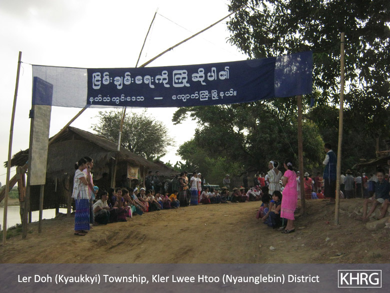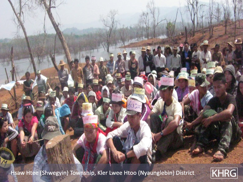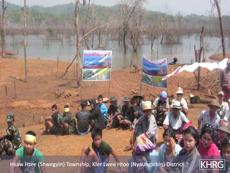 On March 12th 2012, over 400 villagers from A---, M---, H---, T--- and N--- villages gathered together and protested Kyauk N'Ga Dam on the Shwegyin River in N--- area, Hsaw Htee Township and Ler Doh Township, Nyaunglebin District. There were three slogans that the villagers called out: