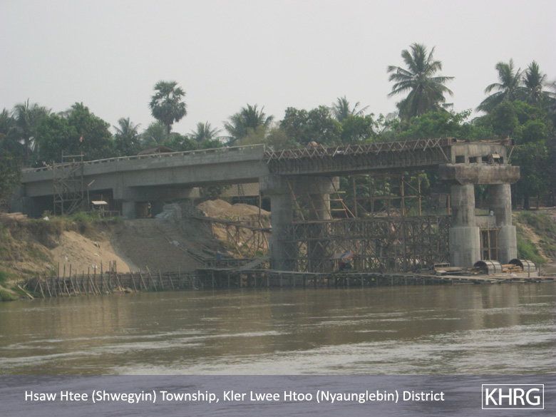 The Burmese government built a bridge on the Sittaung River in Na Tha Kway area, and there are 11 households in Na Tha Kway that had to move. The houses relocated but the government did not give any compensation. The bridge did not replace the old bridge; they build it in the village and it crosses villagers' house gardens. The government did not give any compensation for villagers who had to move or villagers who lost their gardens, so it caused difficulties for the villagers.