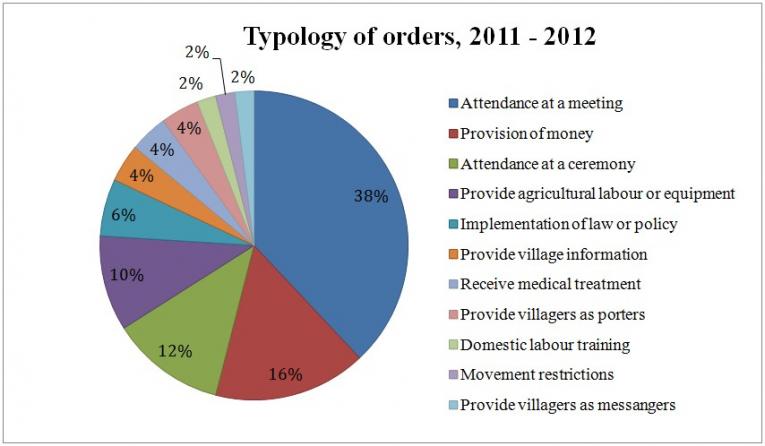 In addition to obscuring the origin of order letters, there has been a correspondent absence of specific written demands. Instead of receiving such details, village heads are frequently called to attend 'meetings' at which military or civilian authorities explain verbally what is required. Of the 44 order documents included in this report issued in 2011 and 2012, 19 (43%) contain requests for village heads to attend meetings; 13 (68%) of these contain a request only for a meeting without articulating any further demands in writing (Orders #2, #6, #21). 14 out of the 30 (47%) order documents sent by civilian government officials and 5 out of 10 (50%) sent by Tatmadaw officials contain, among other things, a request for a meeting.